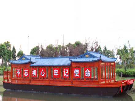 畫(huà)舫船就是裝飾古典華麗的游船,是"中國(guó)風(fēng)"的仿古游船,結(jié)合古典園林建筑,體現(xiàn)了中華文明的古典藝術(shù).畫(huà)舫船豪華而又古典,船上的建筑按照中國(guó)古代建筑里的亭臺(tái)樓閣,建筑工藝之復(fù)雜,要求之嚴(yán)格,仿古畫(huà)舫游船的特點(diǎn)飛檐翹角、玲瓏精致的四角亭子逐漸成形,赫然立于船頭,美人靠、盤(pán)龍柱子、彩畫(huà)……龍柱上的浮雕盤(pán)龍和祥云一層扣著一層,層層錯(cuò)落有致,雕刻精細(xì)到盤(pán)龍身上的每一個(gè)鱗片都細(xì)細(xì)可數(shù),古代皇家標(biāo)志性元素,在畫(huà)舫船上體現(xiàn)的淋漓盡致。除了雕刻、花窗,整條船還有一個(gè)看點(diǎn),那就是弧線(xiàn)優(yōu)美、高高翹起的船尾。游船并不大,長(zhǎng)約10米、寬3米,但是整體看起來(lái)堪稱(chēng)一件藝術(shù)品。船尾的雕花欄桿與船艙、船頭的雕刻遙相呼應(yīng),船身四周貼著浮雕祥云,給整條船增添了富貴、華麗的氣質(zhì)。